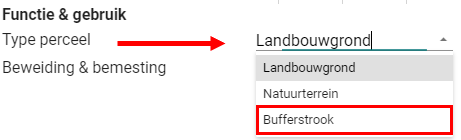 Heb je bij RVO de bufferstroken apart ingetekend? Wijzig dan in CheckAgro het type perceel van “landbouwgrond” naar “bufferstrook” (zie figuur)!